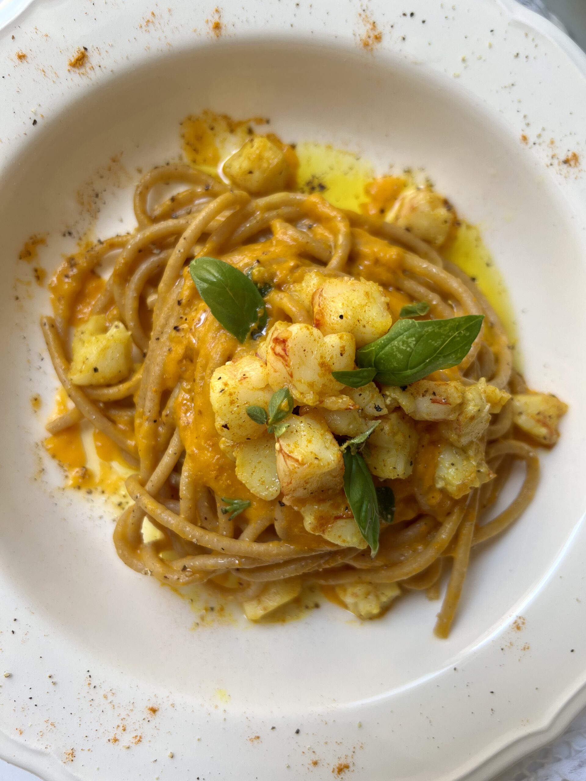 A questo punto impiatta e aggiungi i gamberi, le foglioline di basilico ed un giro di olio extravergine d’oliva a crudo.