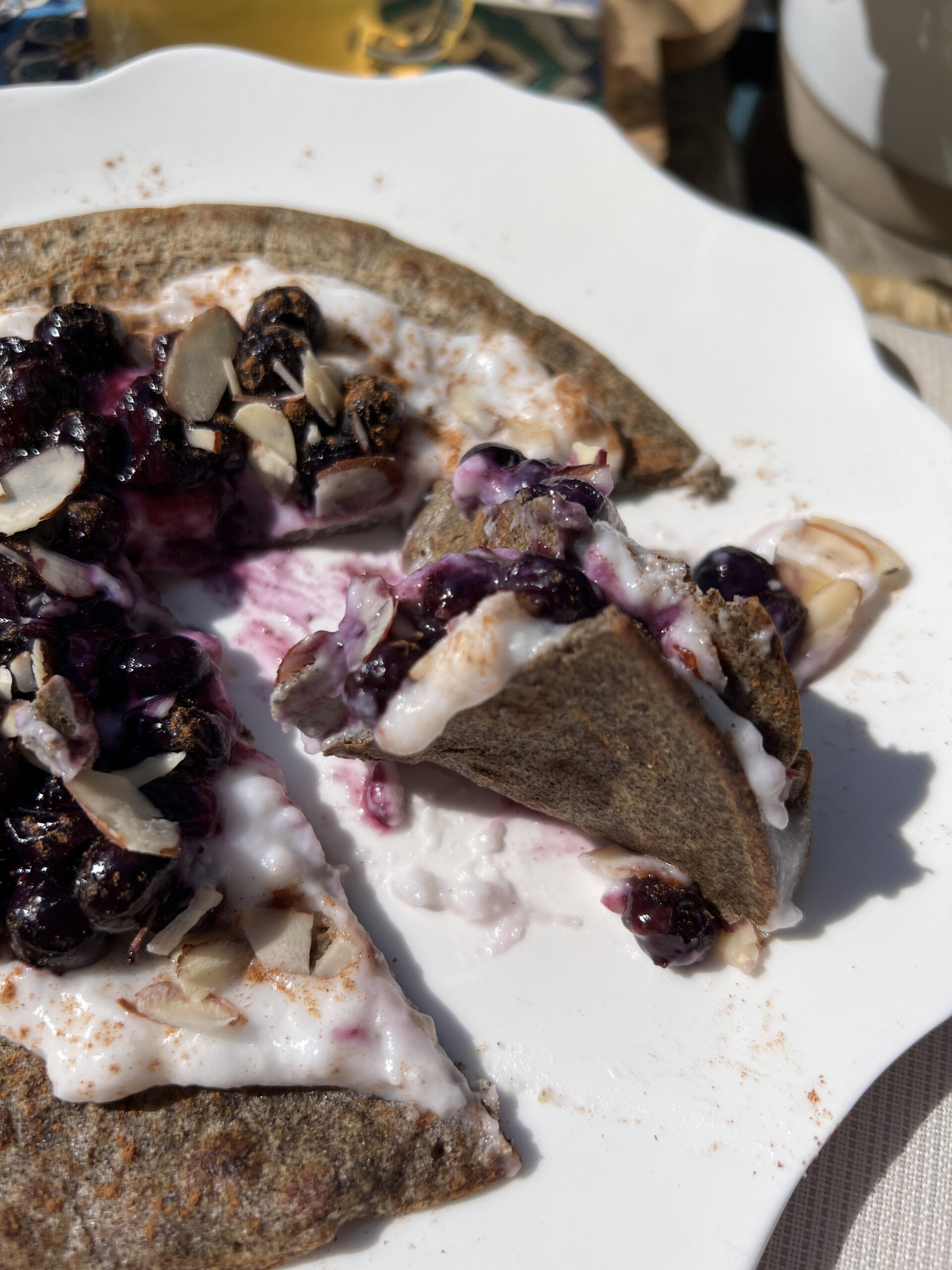 Servi la piadinetta con 2 cucchiai di yogurt al cocco, la marmellata express ed una spolverata di cannella.