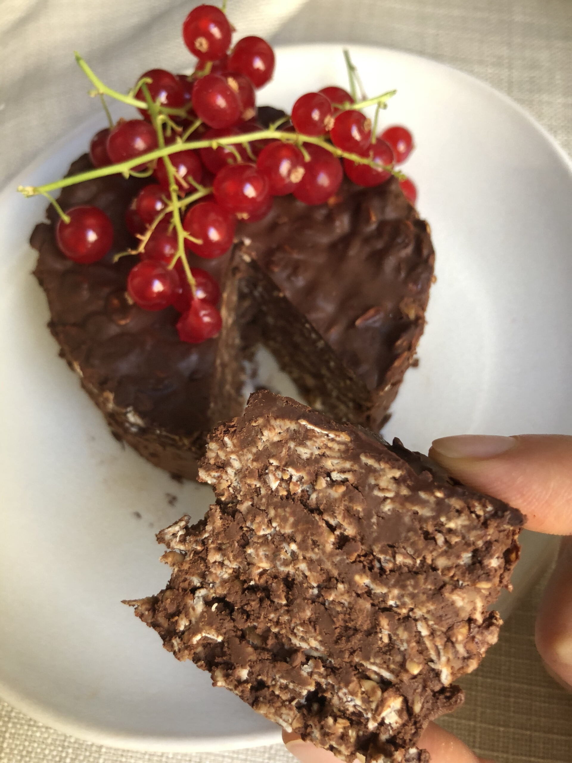 Aggiungi i fiocchi d’avena e mescola. Versa l’impasto in una piccola tortiera con cerniera e metti in frigo per almeno un’ora (meglio se tutta la notte).